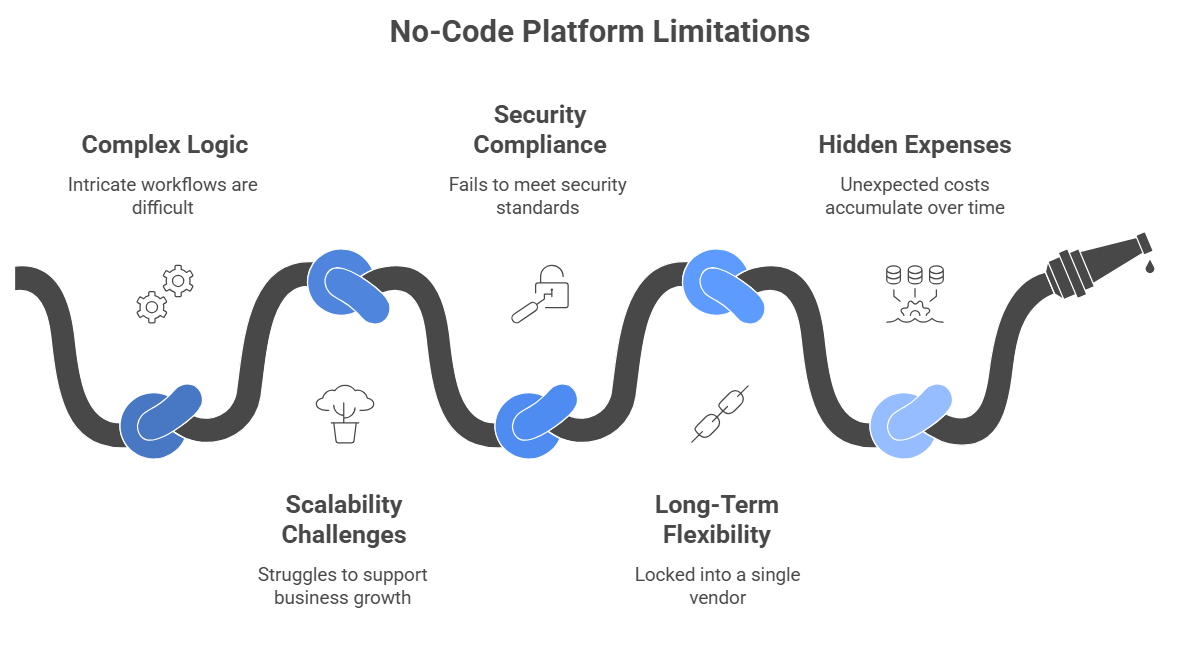 No-code platforms offer tremendous advantages for certain use cases, but they are not a universal solution. In many cases, the long-term limitations of these tools can outweigh the short-term benefits. Here are some key areas where no-code platforms fall short: